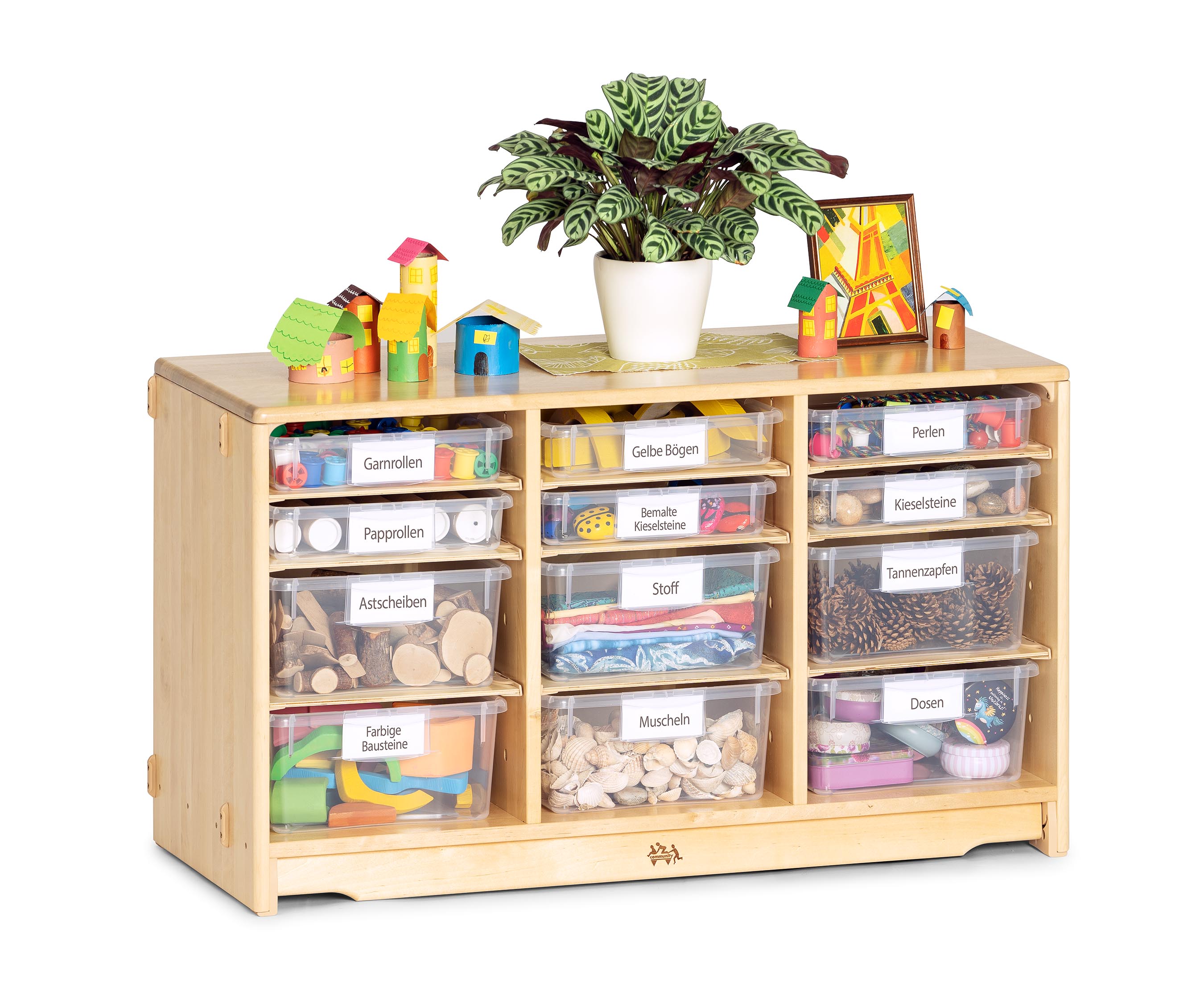 Robuste Materialregale aus Massivholz ermöglichen eine ordentliche Aufbewahrung Ihrer Materialien. Die Fachböden lassen sich verstellen, sodass Platz für flache und tiefe Materialboxen entsteht. Beachten Sie, dass die Materialregale tiefer sind als unsere Fächerregale, und somit etwas mehr Stauraum bieten.