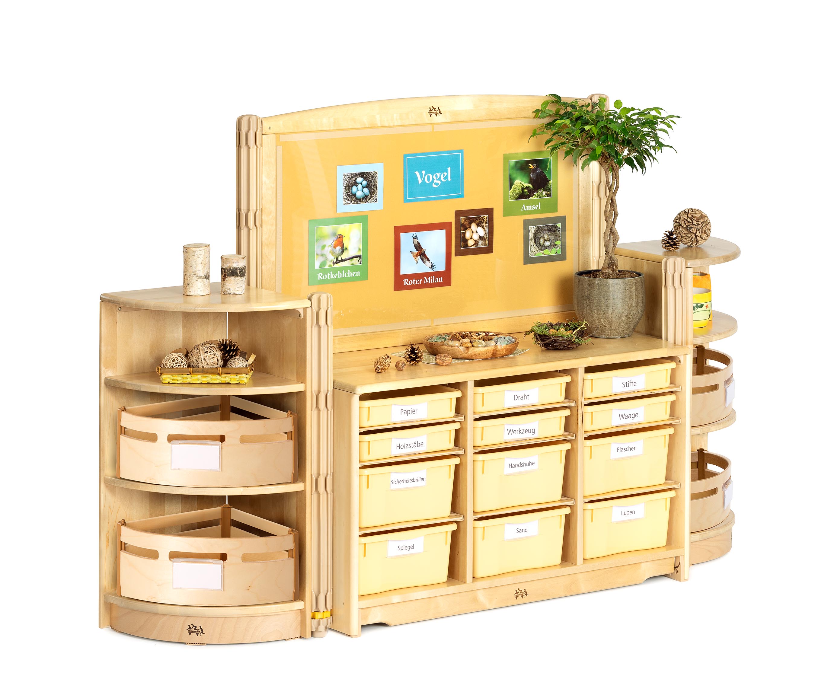 Eine ideale Möglichkeit, ein Thema oder eine zu einem Thema passende Aktivität in der Kita einzuführen oder darzustellen. Präsentieren Sie Poster und Informationen auf dem magnethaftenden Whiteboard. Oben auf dem Regal können auf das Thema bezogene Gegenstände ausgestellt werden, während andere Materialien in den darunter liegenden Fächern aufbewahrt werden.