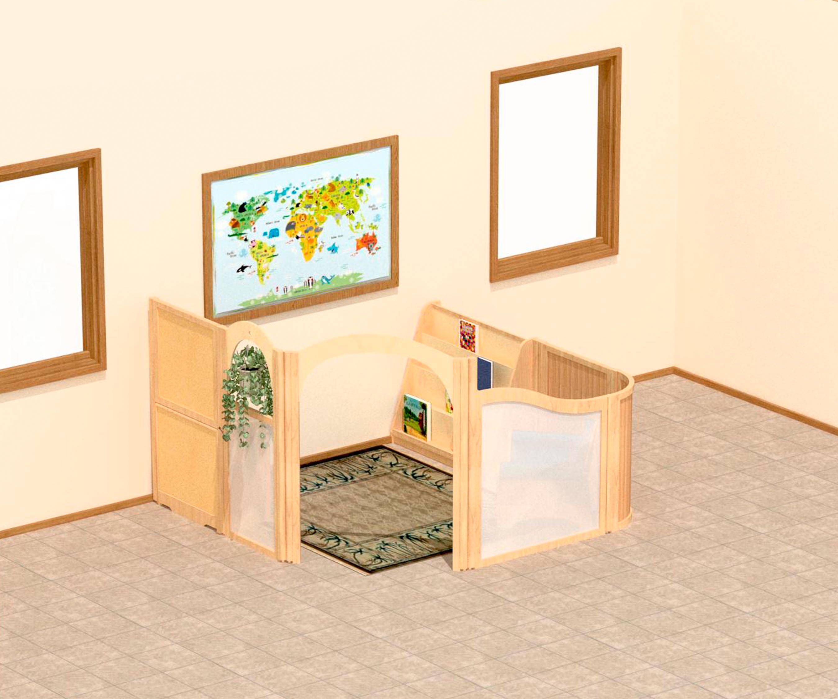 Treten Sie aus der lebhaften Energie des Gruppenraumes heraus und betreten Sie diesen wunderschönen, ruhigen Bereich. Er bietet Schutz und Ruhe und lädt die Kinder auf natürliche Weise dazu ein, friedlich und konzentriert zu spielen.