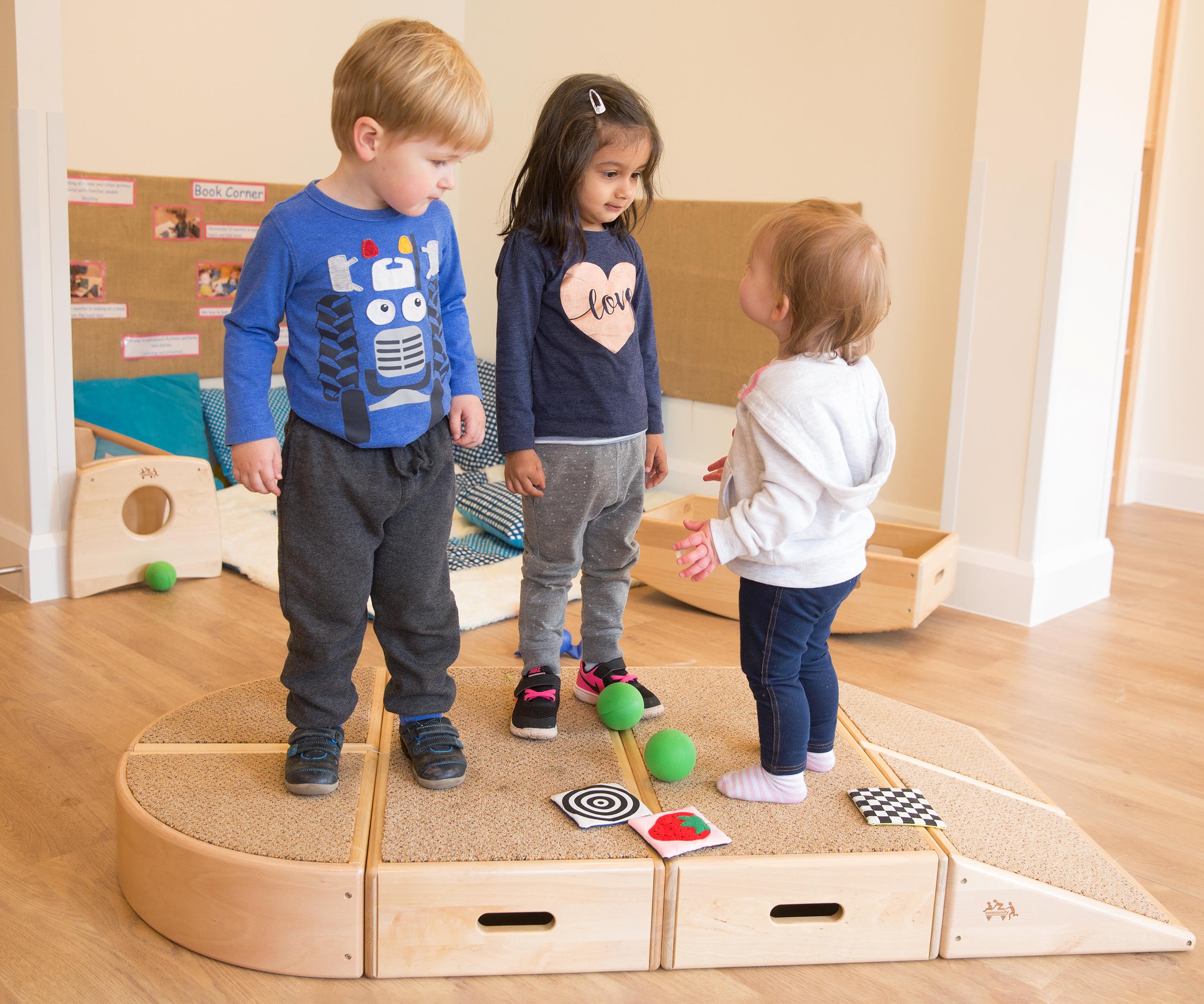 In Kombination mit anderen Krabbelboxen ergeben sich gewundene Pfade, die zu Bewegung einladen. Umgedreht ergibt sich ein kleiner Raum zum hineinklettern. Die Elemente lassen sich mit speziellen Kupplungsstücken verbinden und können leicht umgestellt werden.