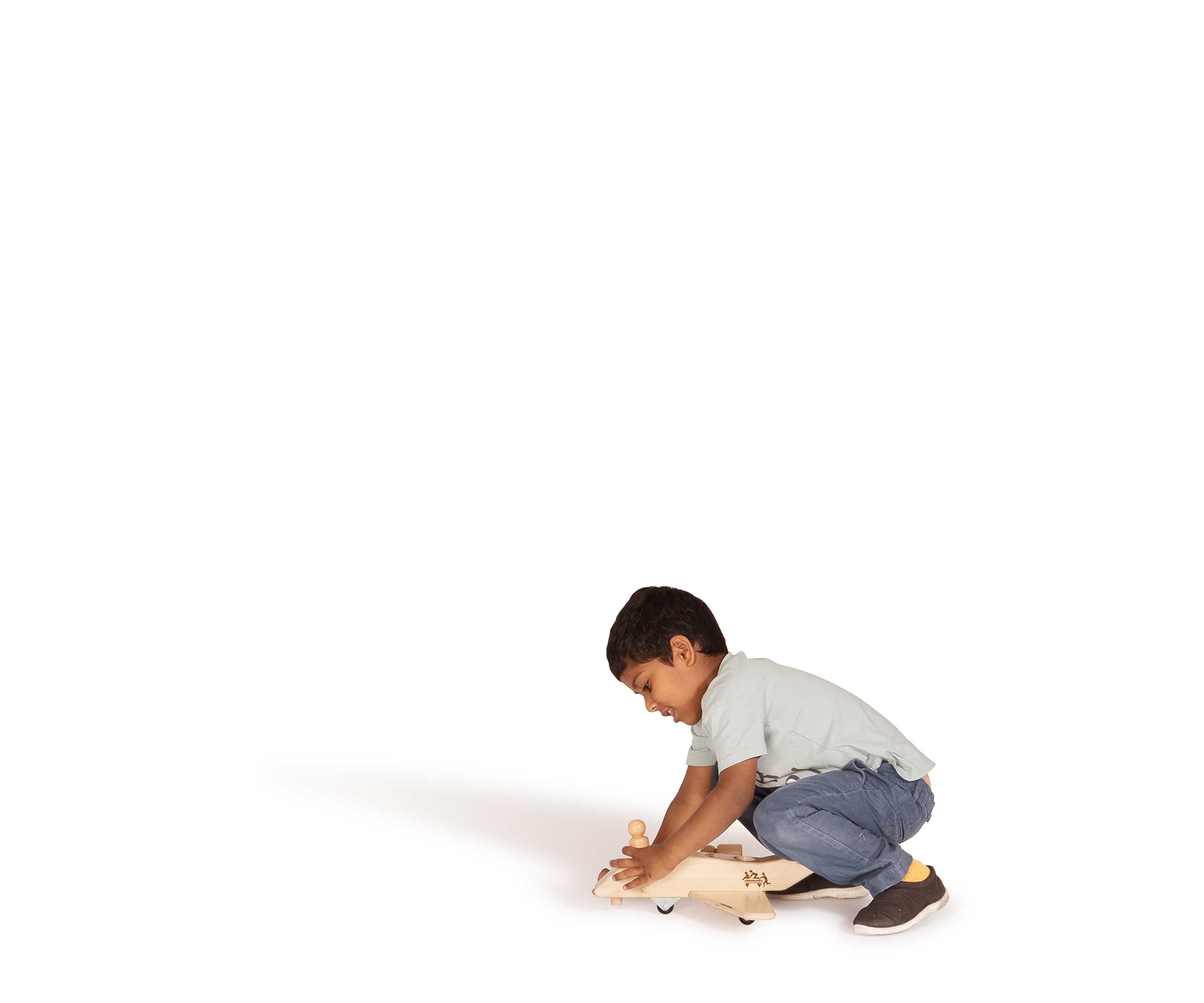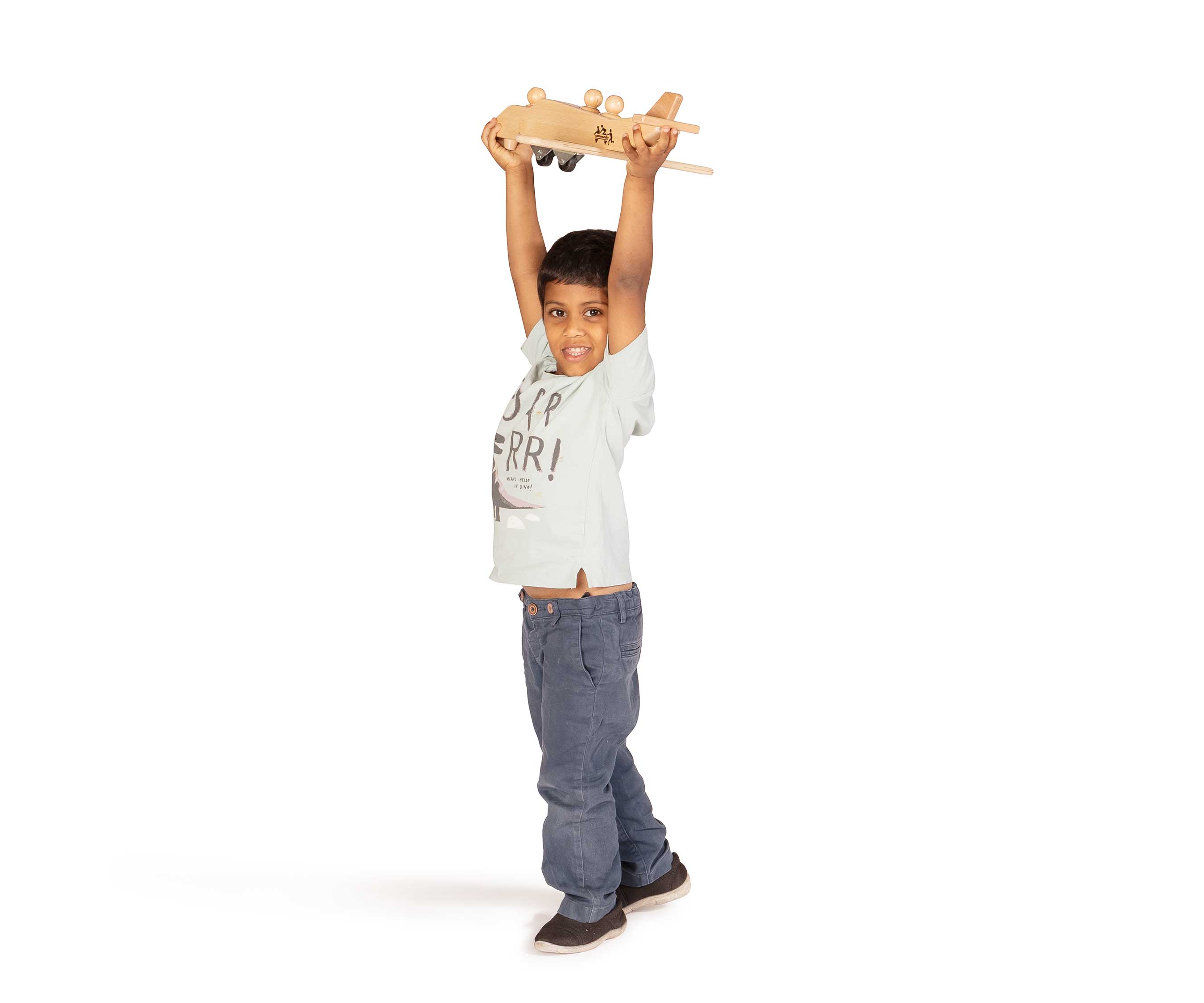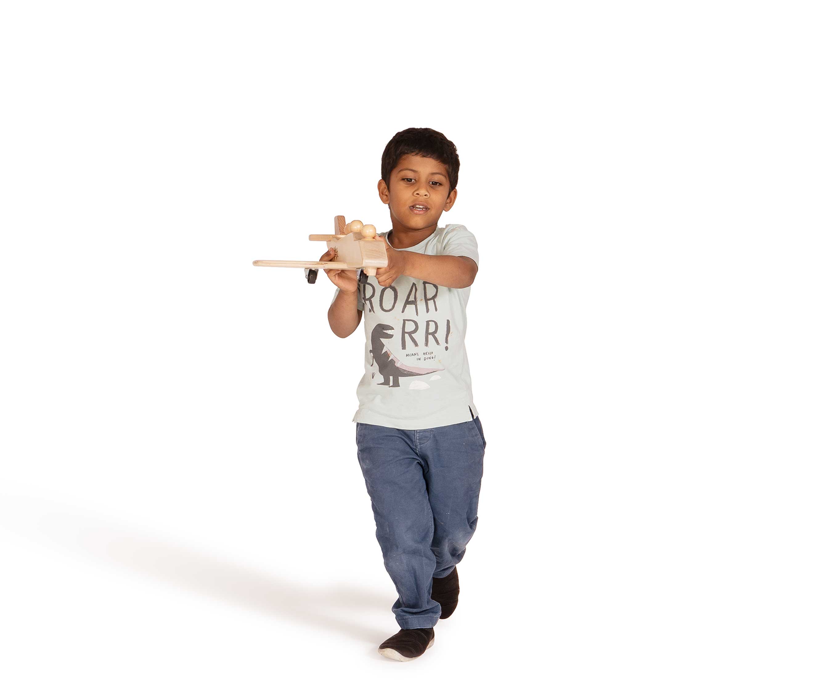 Das einfache Design des Flugzeugs mit seinen nach hinten geschwungenen Flügeln und abgerundeten Ecken regt die Fantasie an und erweitert und fordert das Spiel der Kinder.