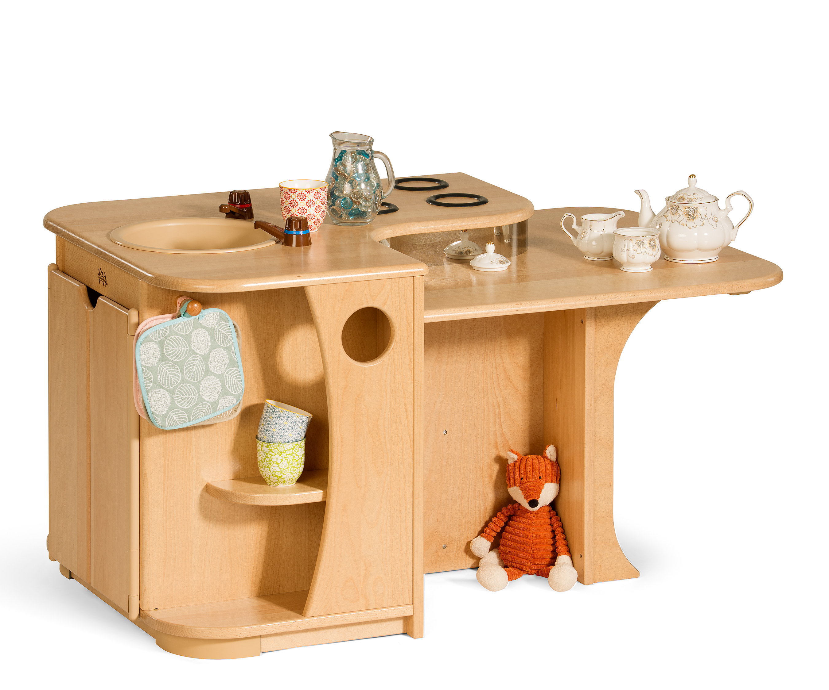 Die hohe Kücheninsel ist von allen Seiten zugänglich ist und fördert so Bewegung und Interaktion anstelle des Spielens an festen Positionen. Kinder können auf dem Kochfeld „kochen“, ihre Freunde über die Arbeitsplatte bedienen und Geschirr zum Spülbecken reichen – alles ohne Unterbrechung des Gesprächs!