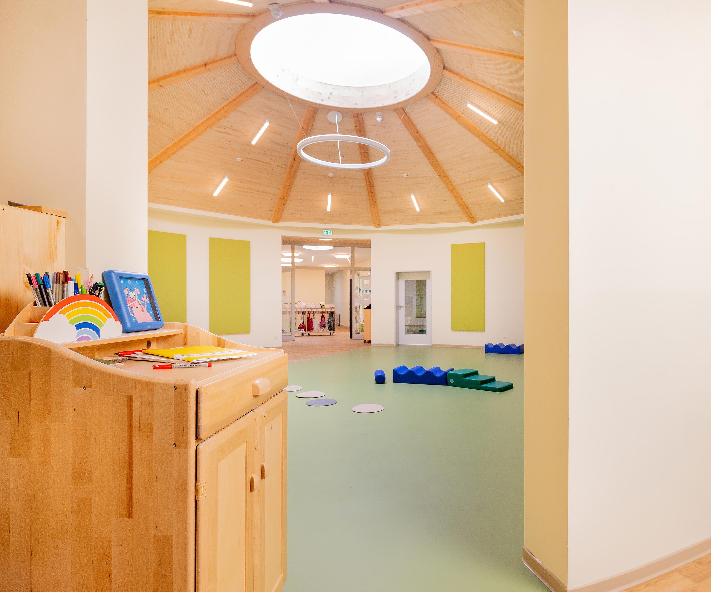 Ein modernes, rundes Gebäude mit Räumen, die wie die Speichen eines Rades angeordnet sind – eine architektonische Herausforderung für jedes Einrichtungskonzept. Wie lassen sich Kita-Möbel harmonisch in Räume integrieren, die keine rechten Winkel aufweisen? Die flexiblen Einrichtungsoptionen von Community Playthings boten der Kita Zwergenburg genau das, wonach sie suchte: eine einfach umzusetzende und zugleich ästhetisch ansprechende Lösung, die sich perfekt an die besonderen räumlichen Gegebenheiten anpasst.