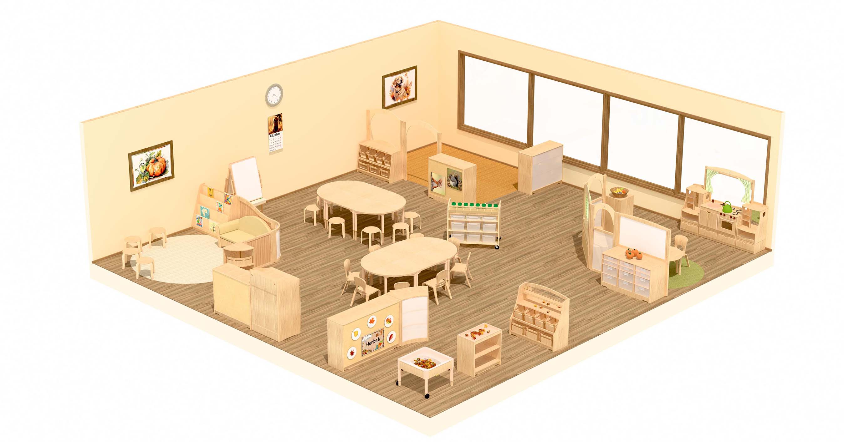 Derselbe Kindergartenraum, dieselben Möbel – drei Raumgestaltungen